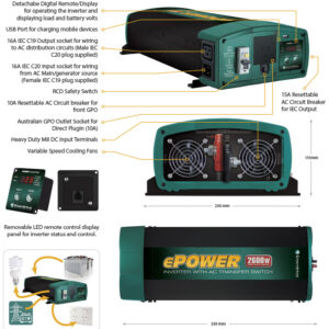 The ePOWER 2000W Inverter, equipped with AC Transfer and Safety Switch, belongs to Enerdrive’s lineup of cost-effective, high-quality professional inverters. Utilizing advanced power conversion technology, ePOWER inverters provide clean and energy-efficient true sine wave AC power sourced from your DC supply.